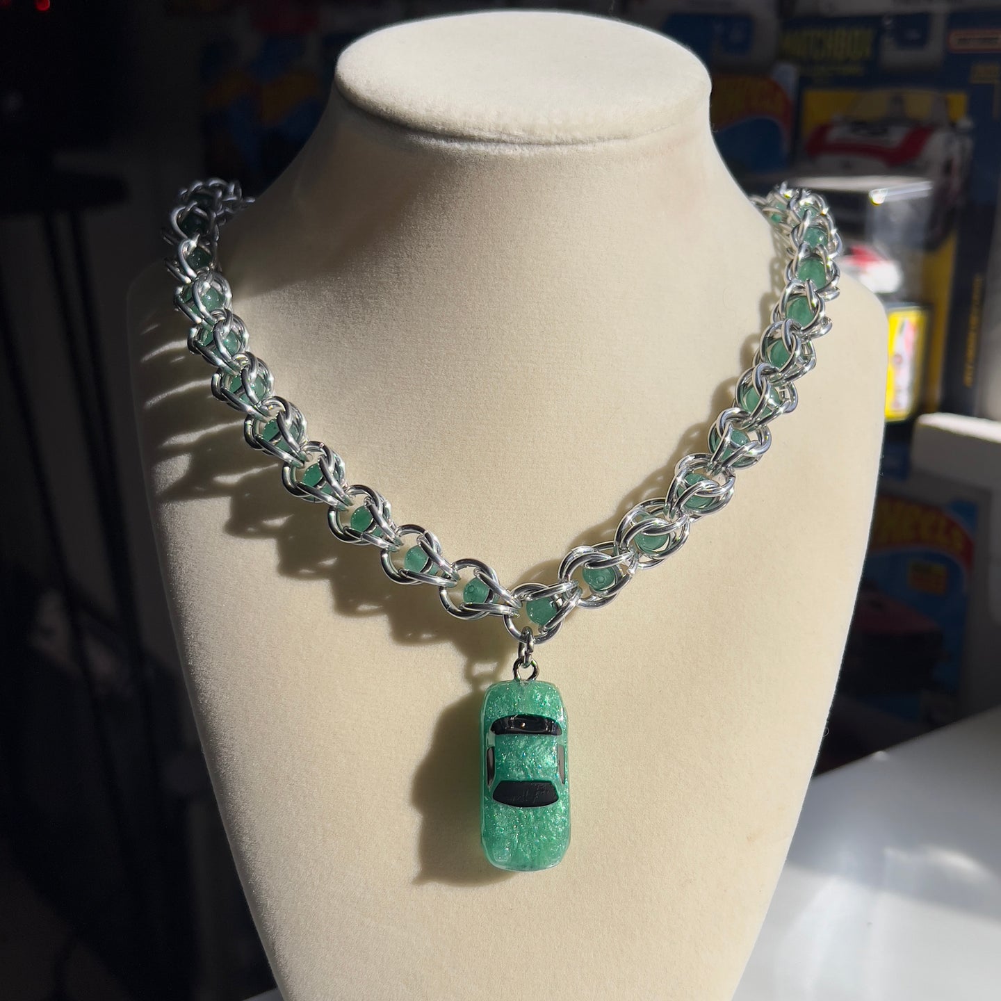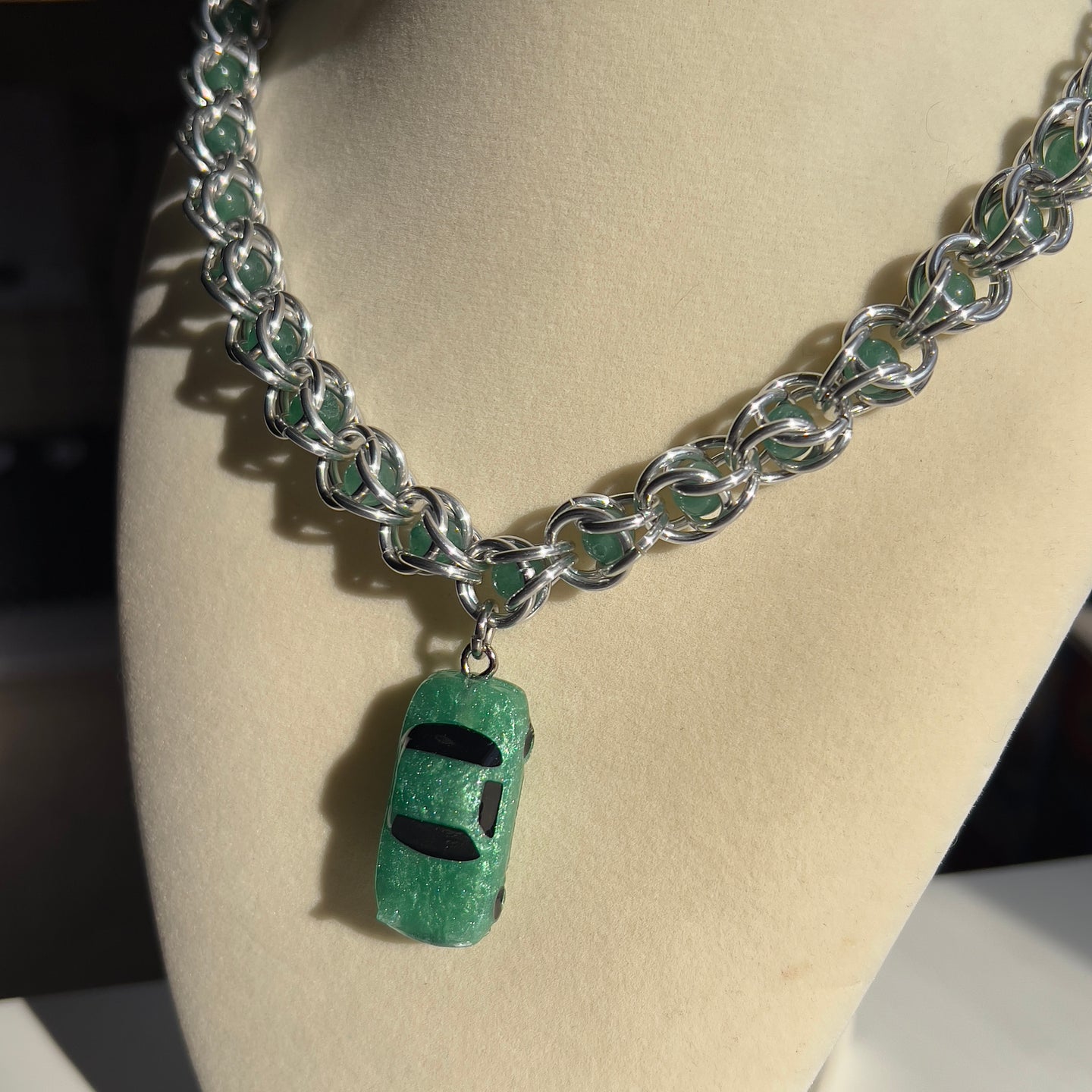 The necklaces are made from 3D printed cars and resin cars, beads, stainless steel wire, charms, and clay. Please note that these necklaces are made by hand. Because these are made by a human, and not a machine, there may be some small imperfections in the charms, beads, or any other part of the necklace.