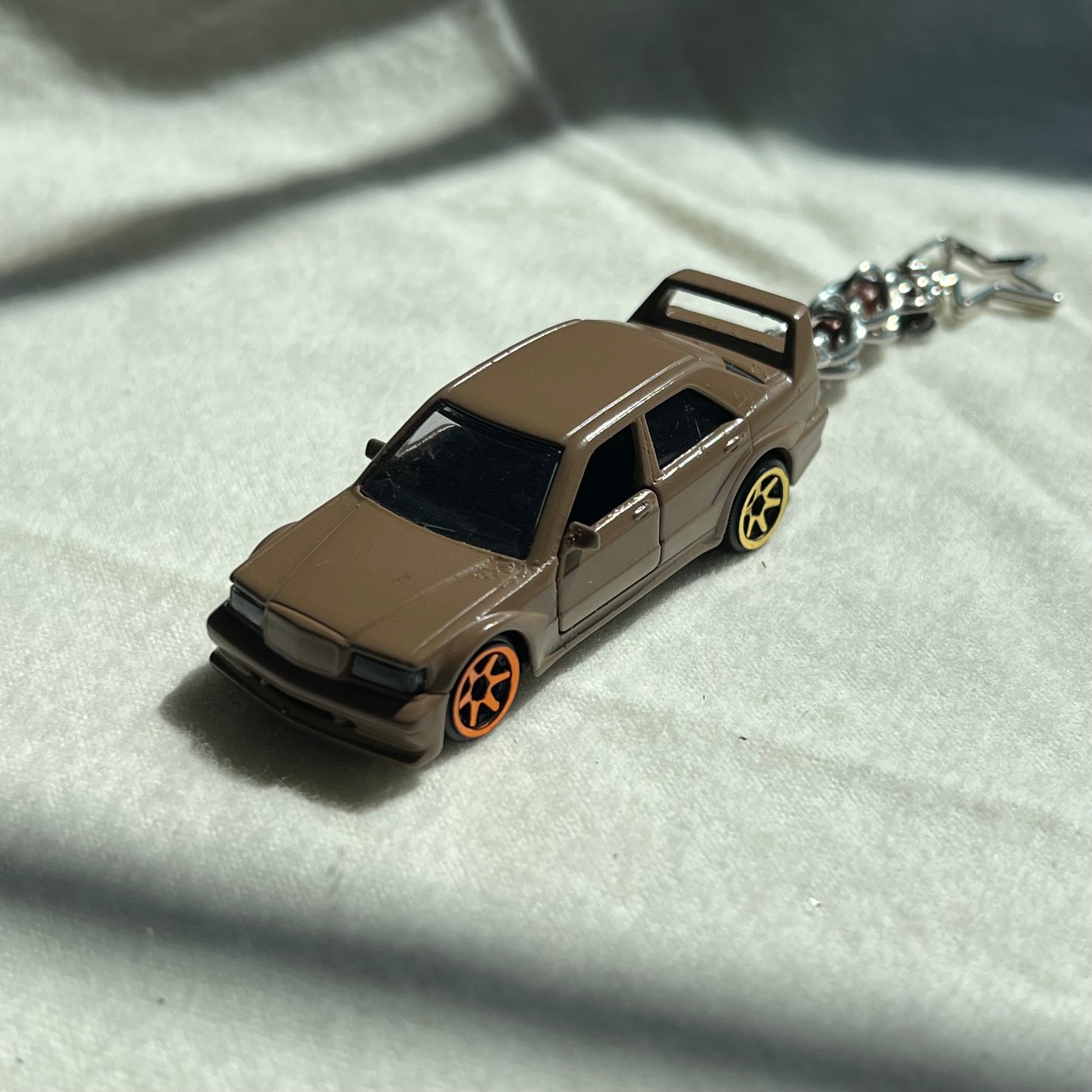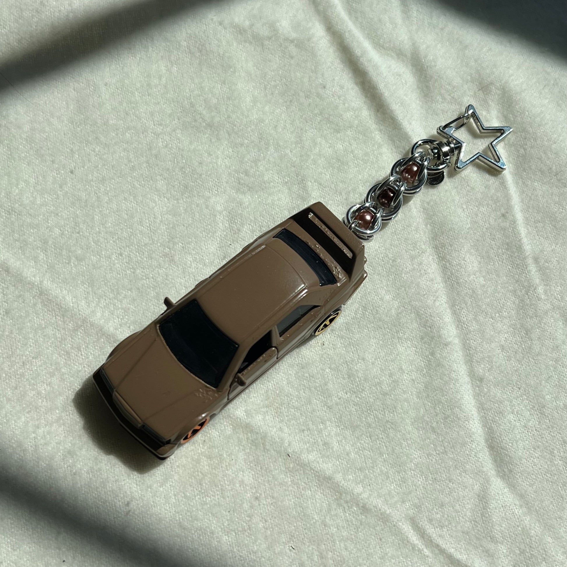The keychains are made from 3D printed cars, resin cars, diecast cars, beads, stainless steel wire, charms, and clay. Please note that these keychains are made by hand. Because these are made by a human, and not a machine, there may be some small imperfections in the charms, beads, or any other part of the keychain.