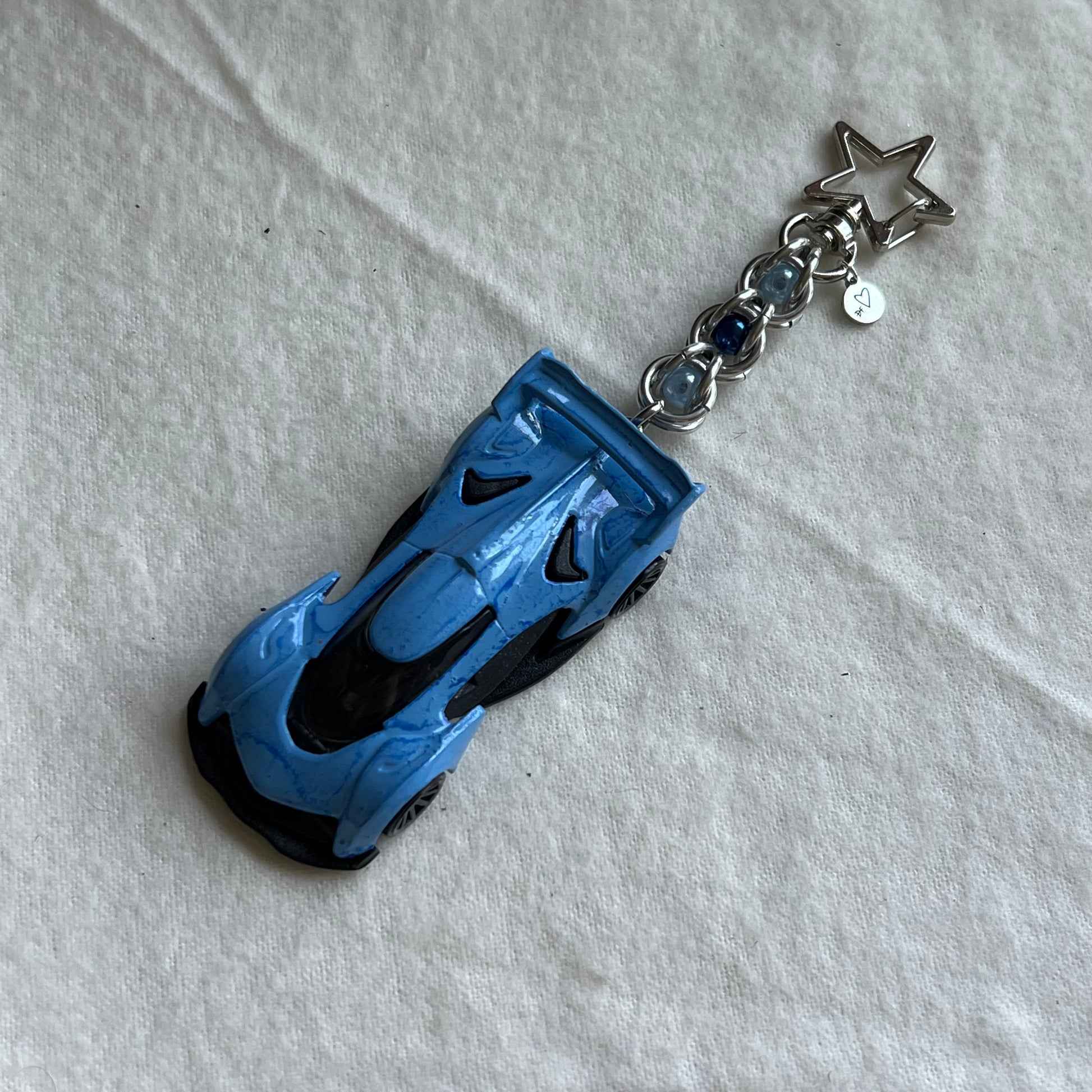 The keychains are made from 3D printed cars, resin cars, diecast cars, beads, stainless steel wire, charms, and clay. Please note that these keychains are made by hand. Because these are made by a human, and not a machine, there may be some small imperfections in the charms, beads, or any other part of the keychain.