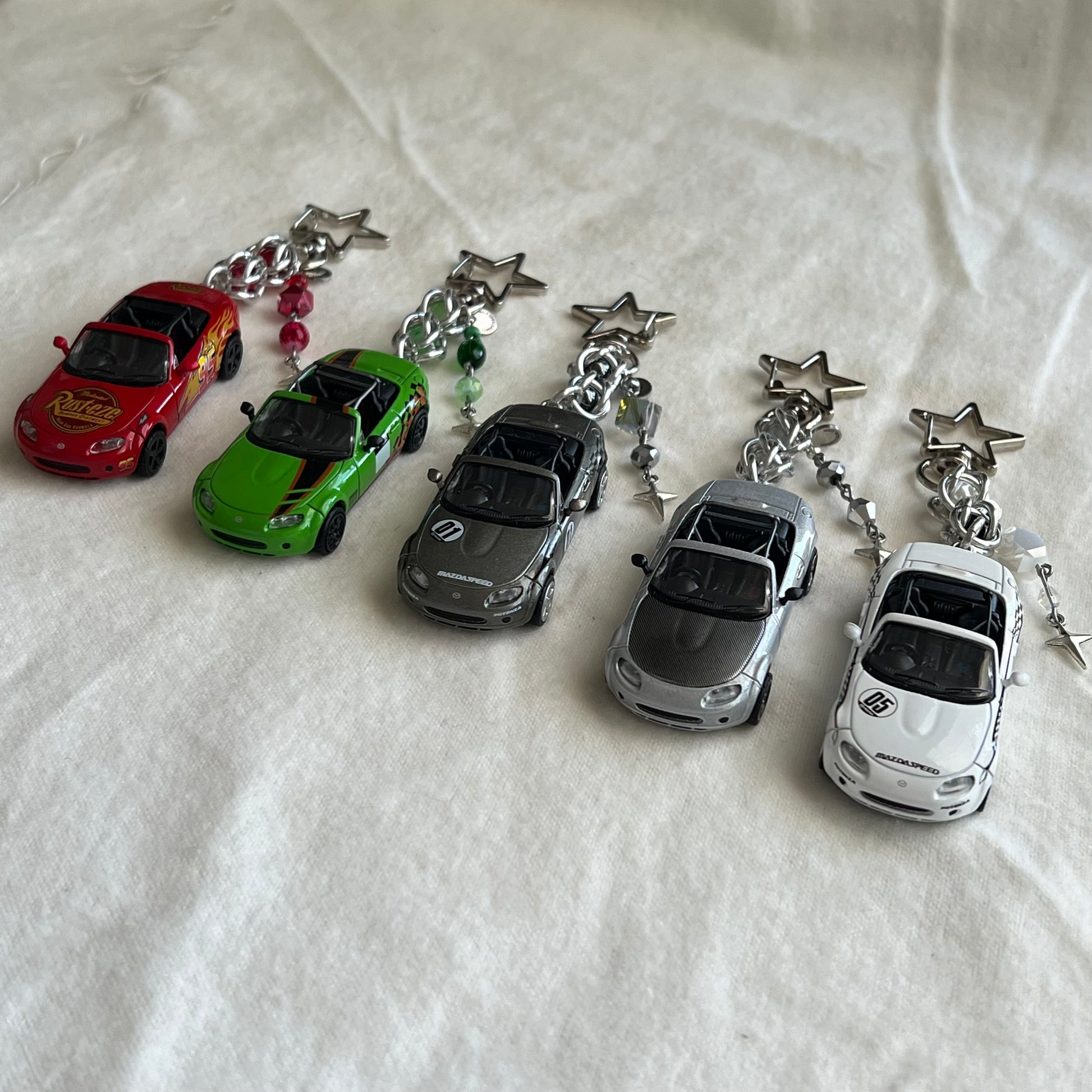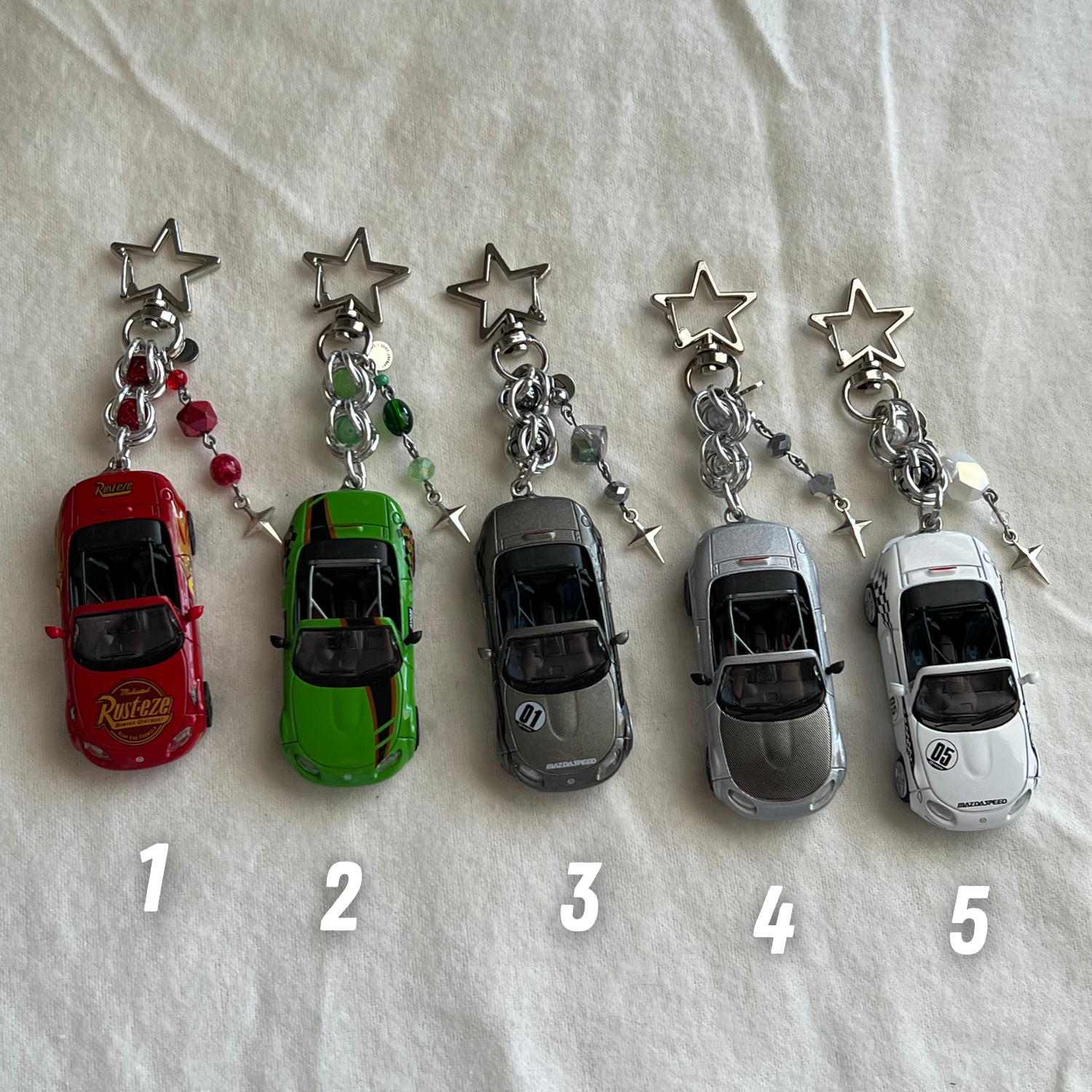The keychains are made from 3D printed cars, resin cars, diecast cars, beads, stainless steel wire, charms, and clay. Please note that these keychains are made by hand. Because these are made by a human, and not a machine, there may be some small imperfections in the charms, beads, or any other part of the keychain.