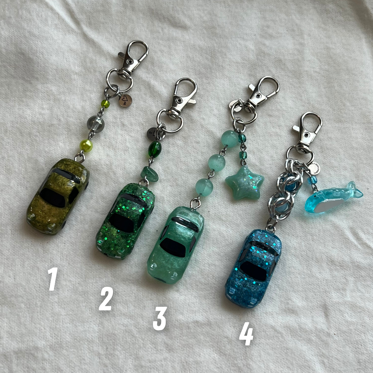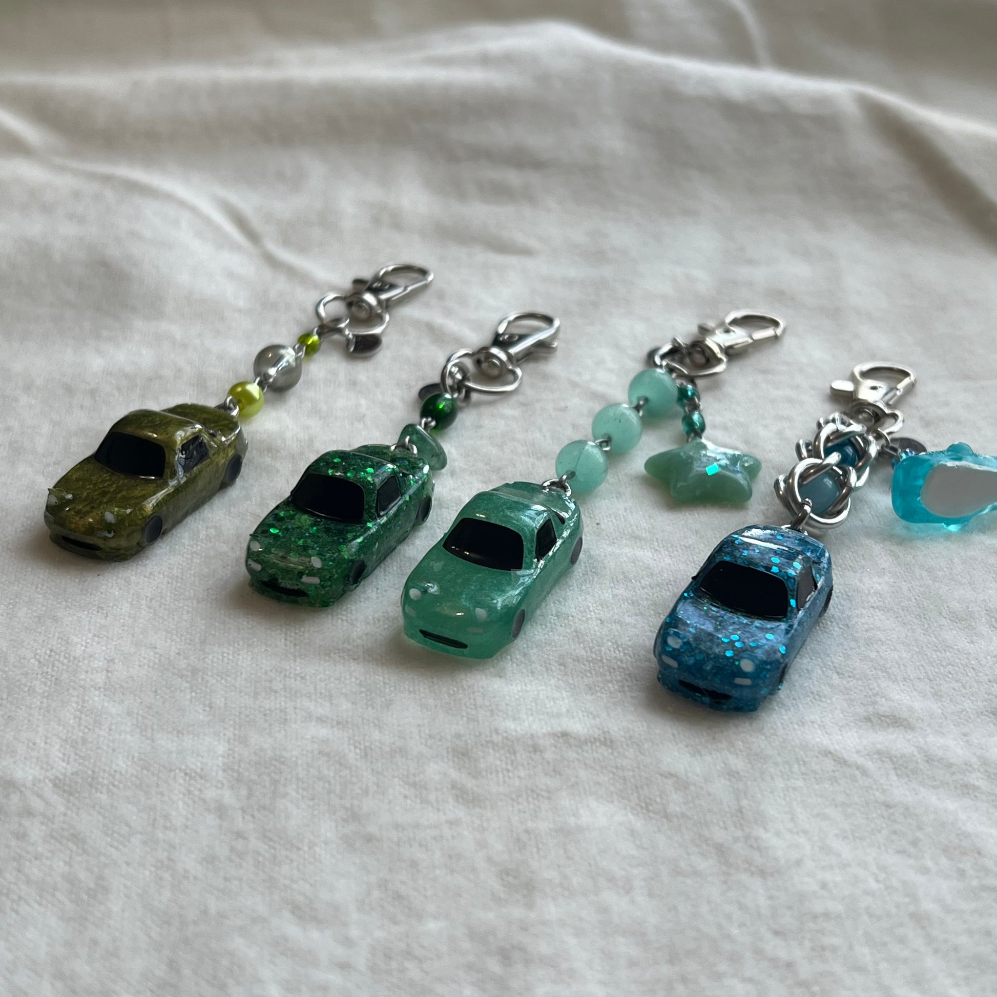 The keychains are made from 3D printed cars, resin cars, diecast cars, beads, stainless steel wire, charms, and clay. Please note that these keychains are made by hand. Because these are made by a human, and not a machine, there may be some small imperfections in the charms, beads, or any other part of the keychain.