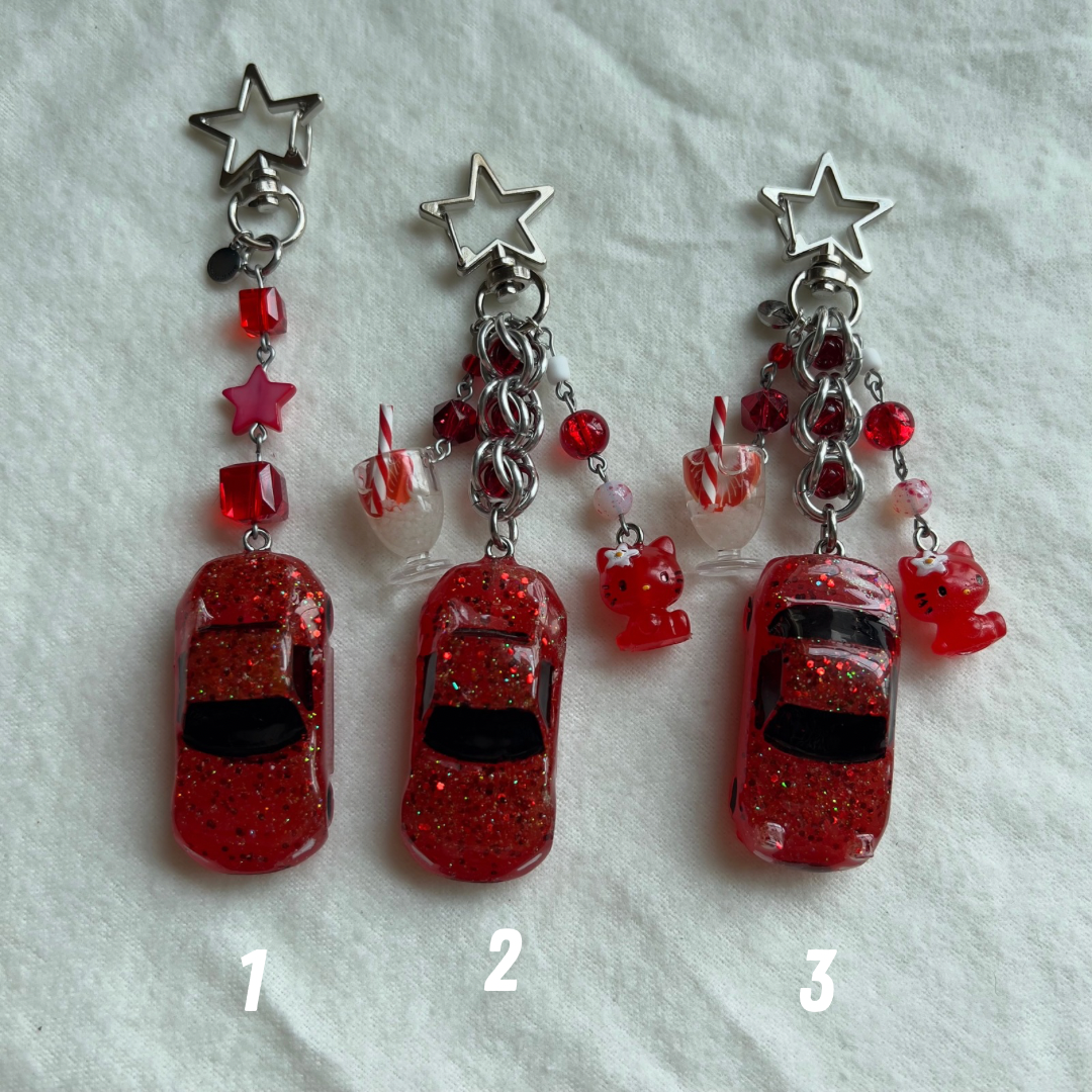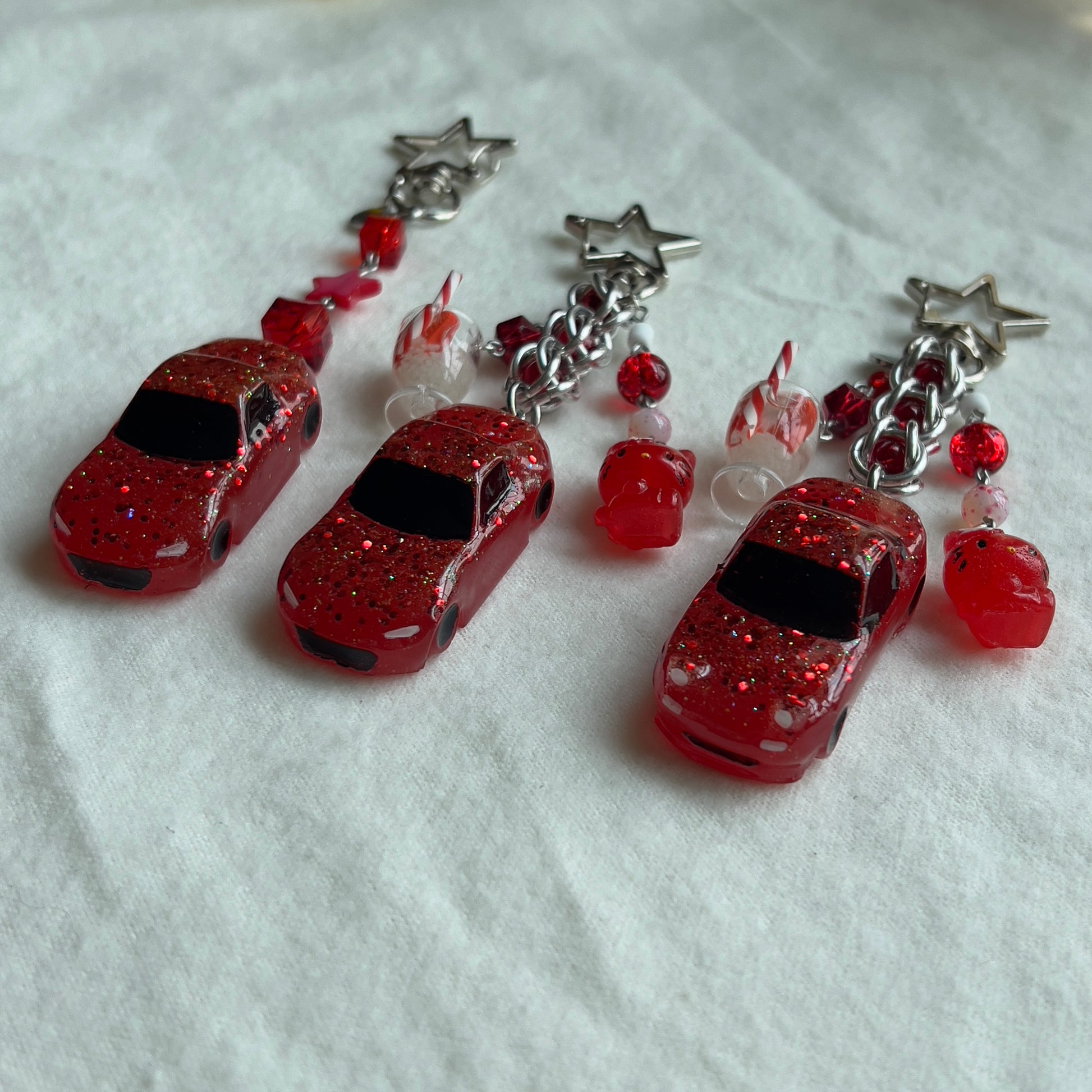 The keychains are made from 3D printed cars, resin cars, diecast cars, beads, stainless steel wire, charms, and clay. Please note that these keychains are made by hand. Because these are made by a human, and not a machine, there may be some small imperfections in the charms, beads, or any other part of the keychain.