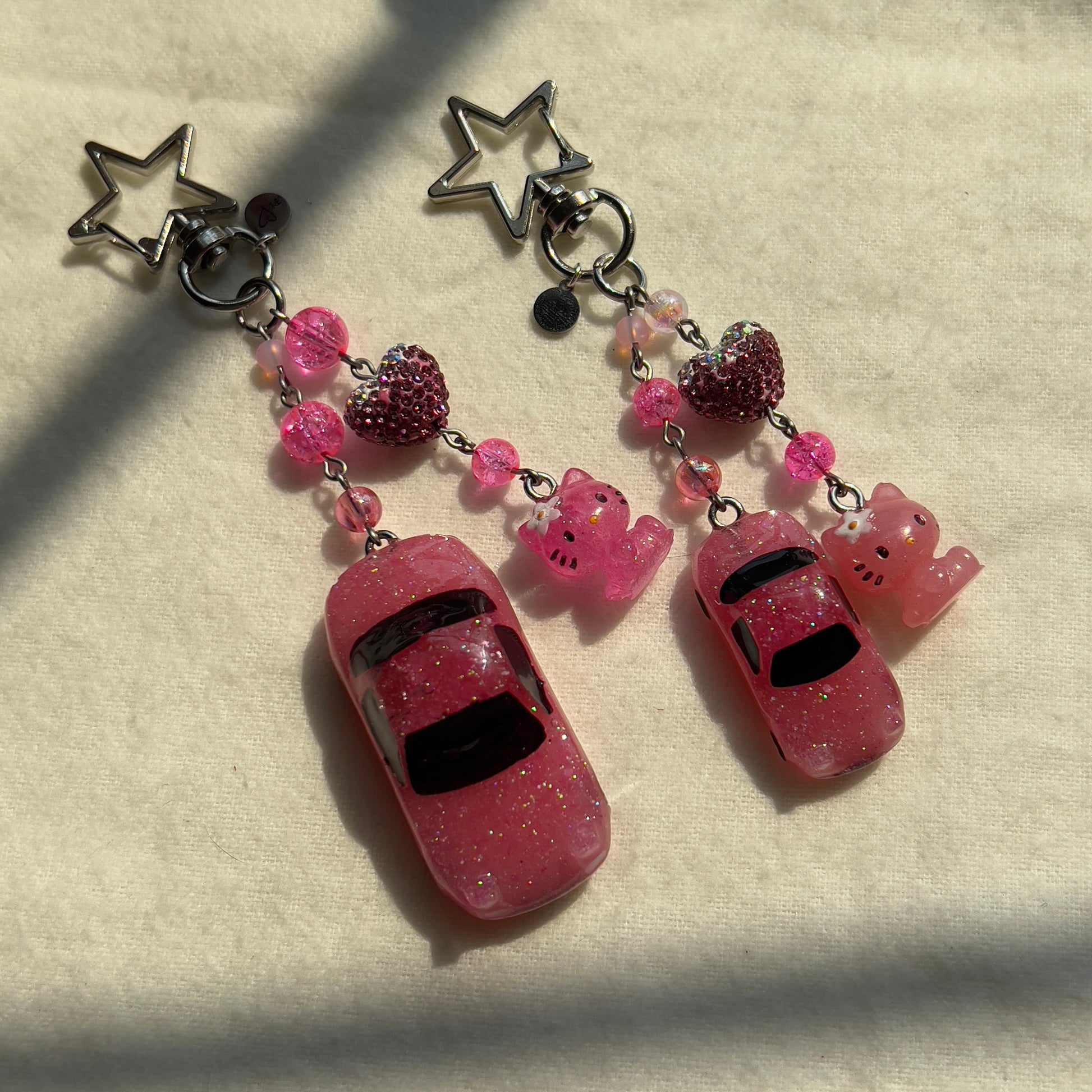 The keychains are made from 3D printed cars, resin cars, diecast cars, beads, stainless steel wire, charms, and clay. Please note that these keychains are made by hand. Because these are made by a human, and not a machine, there may be some small imperfections in the charms, beads, or any other part of the keychain.