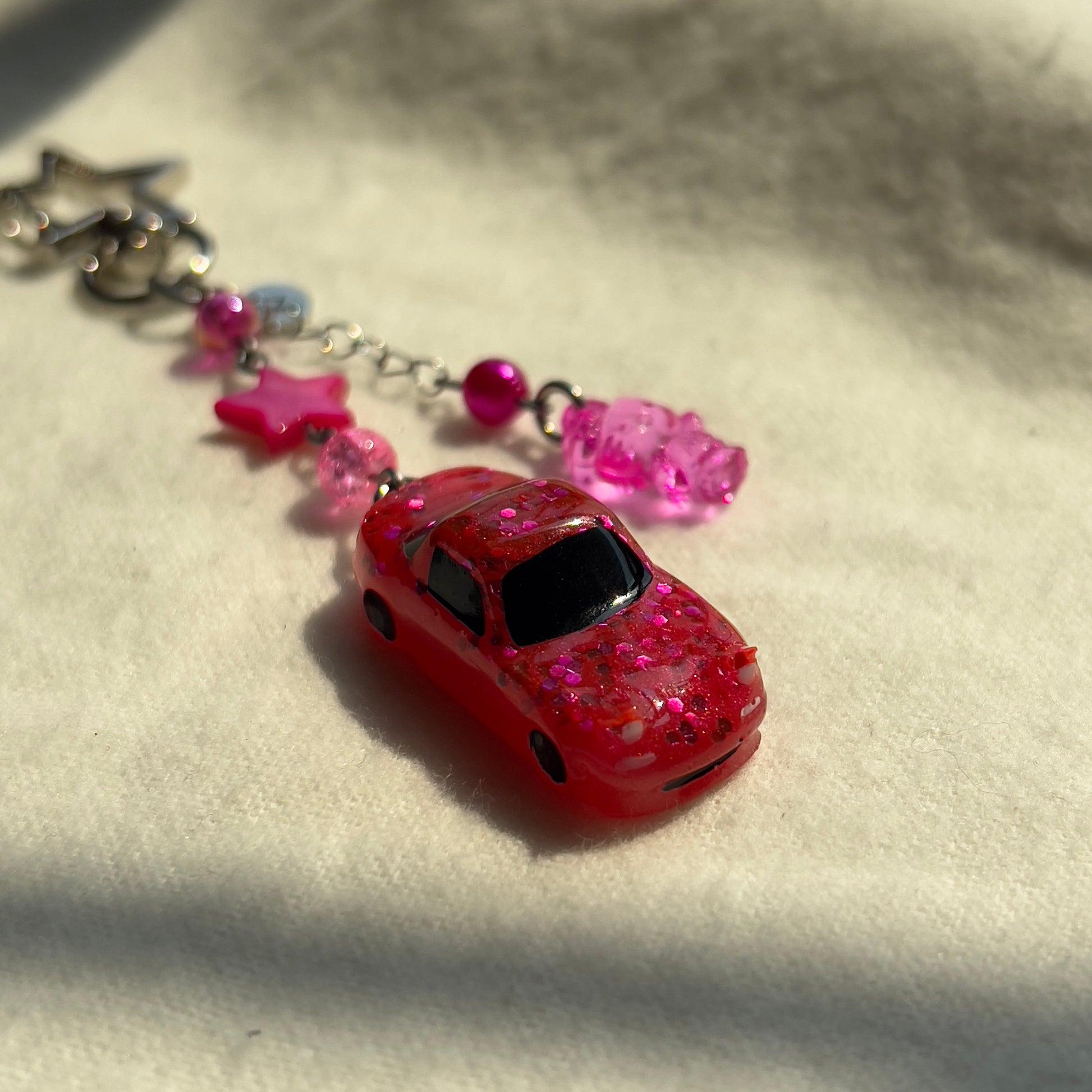 The keychains are made from 3D printed cars, resin cars, diecast cars, beads, stainless steel wire, charms, and clay. Please note that these keychains are made by hand. Because these are made by a human, and not a machine, there may be some small imperfections in the charms, beads, or any other part of the keychain.