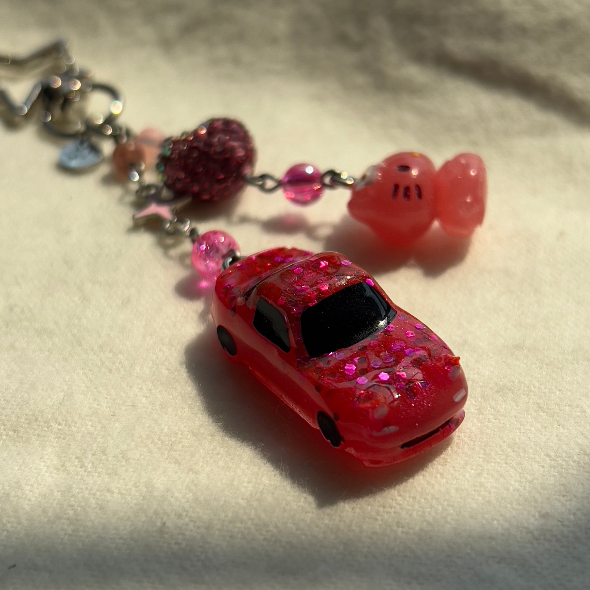 The keychains are made from 3D printed cars, resin cars, diecast cars, beads, stainless steel wire, charms, and clay. Please note that these keychains are made by hand. Because these are made by a human, and not a machine, there may be some small imperfections in the charms, beads, or any other part of the keychain.
