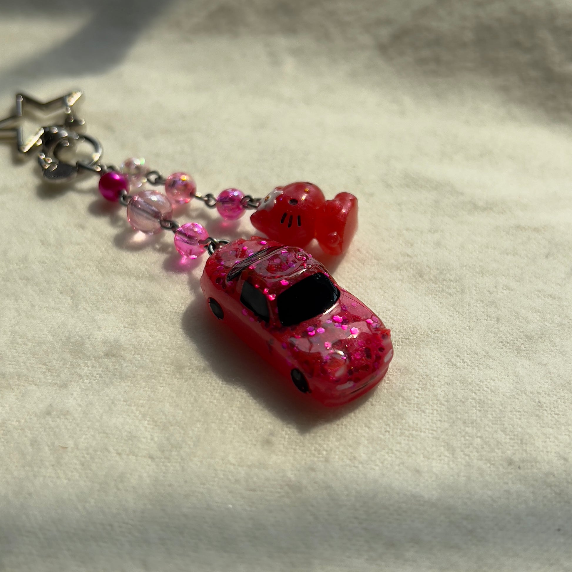 The keychains are made from 3D printed cars, resin cars, diecast cars, beads, stainless steel wire, charms, and clay. Please note that these keychains are made by hand. Because these are made by a human, and not a machine, there may be some small imperfections in the charms, beads, or any other part of the keychain.