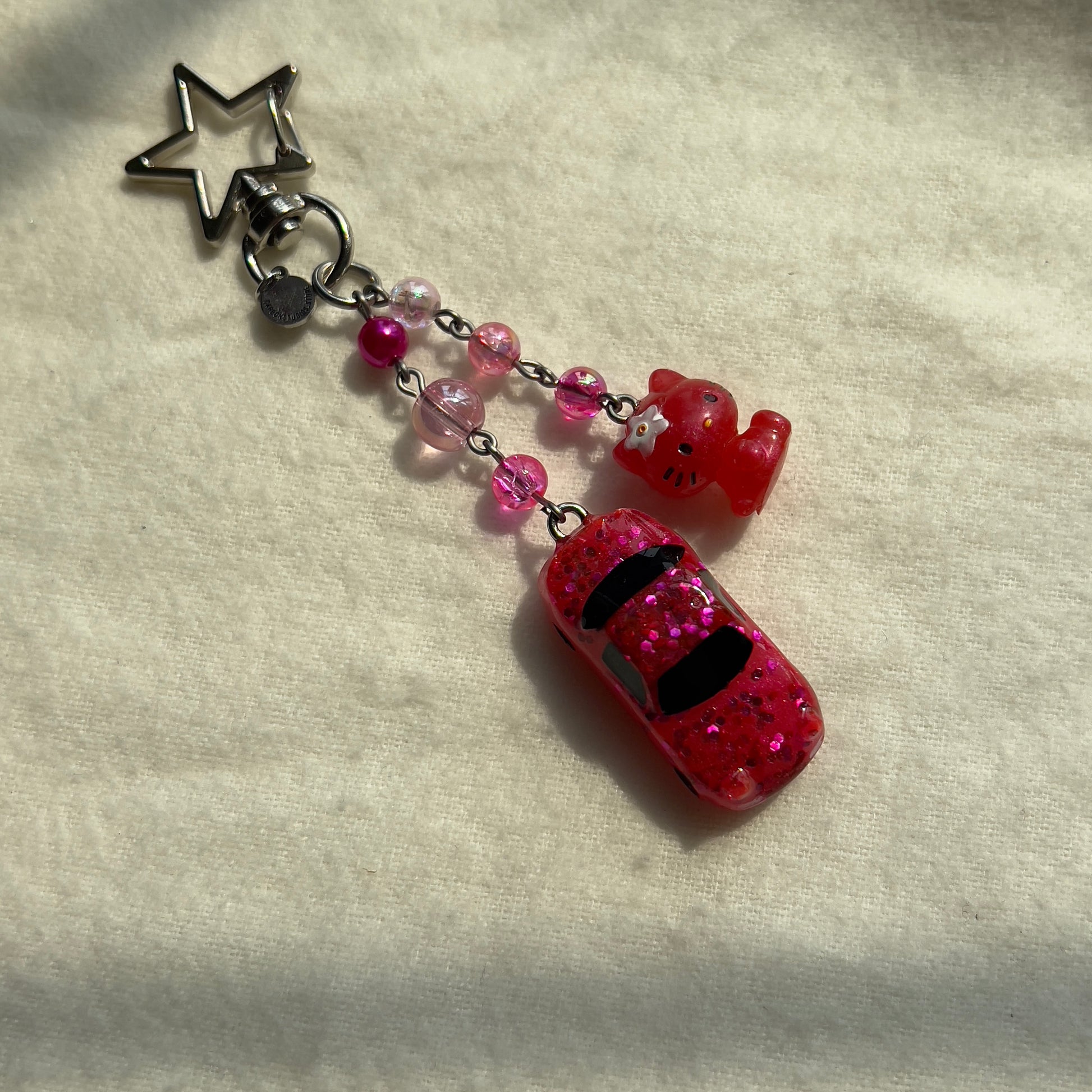 Pink Mini NA Miata & Kitty Beaded Keychain