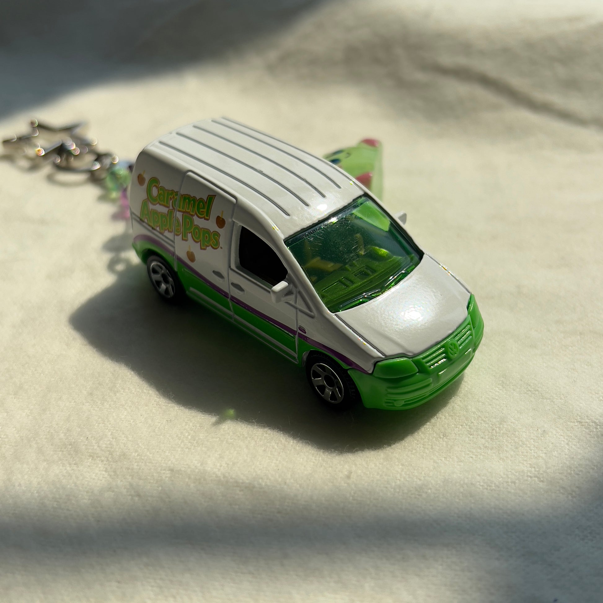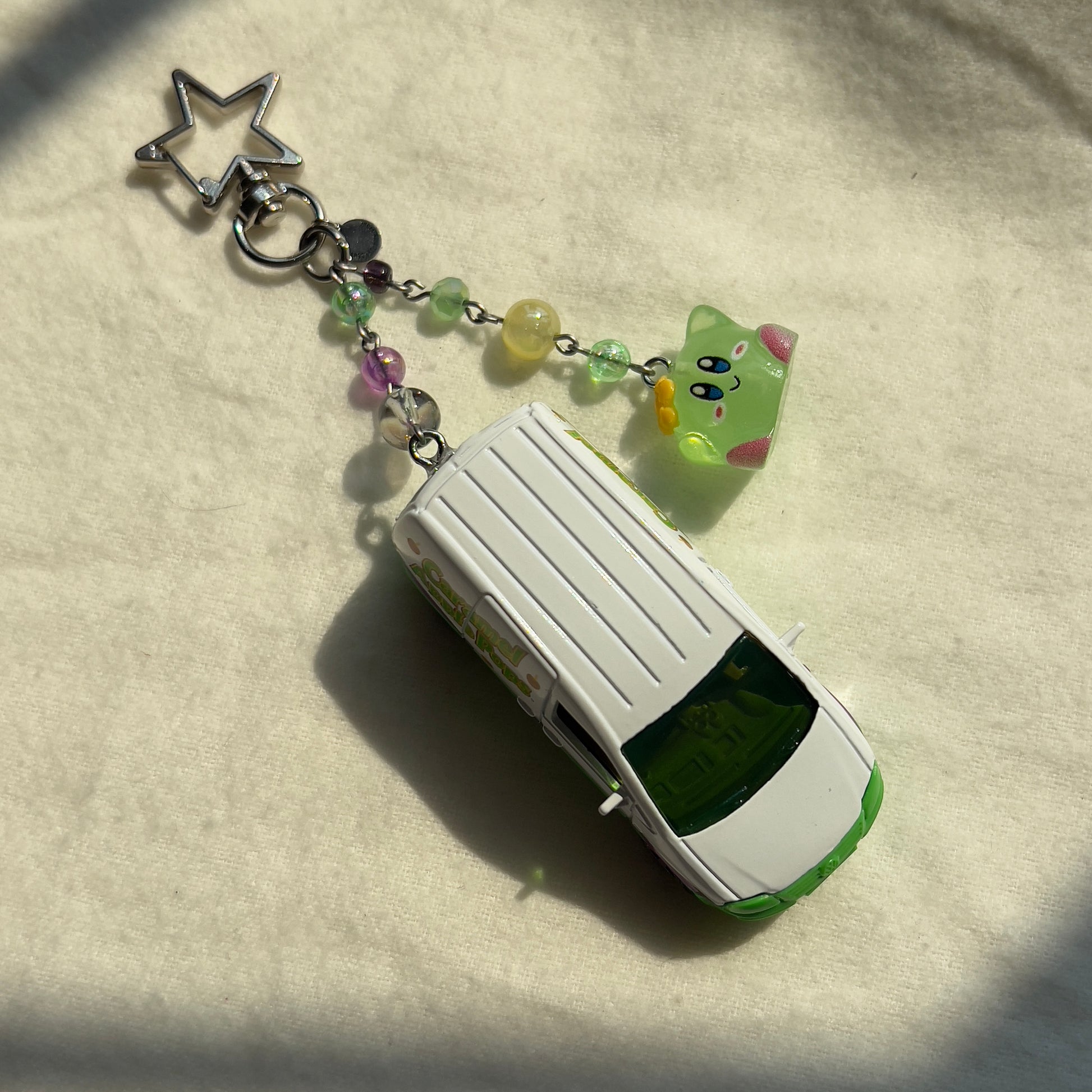 The keychains are made from 3D printed cars, resin cars, diecast cars, beads, stainless steel wire, charms, and clay. Please note that these keychains are made by hand. Because these are made by a human, and not a machine, there may be some small imperfections in the charms, beads, or any other part of the keychain.