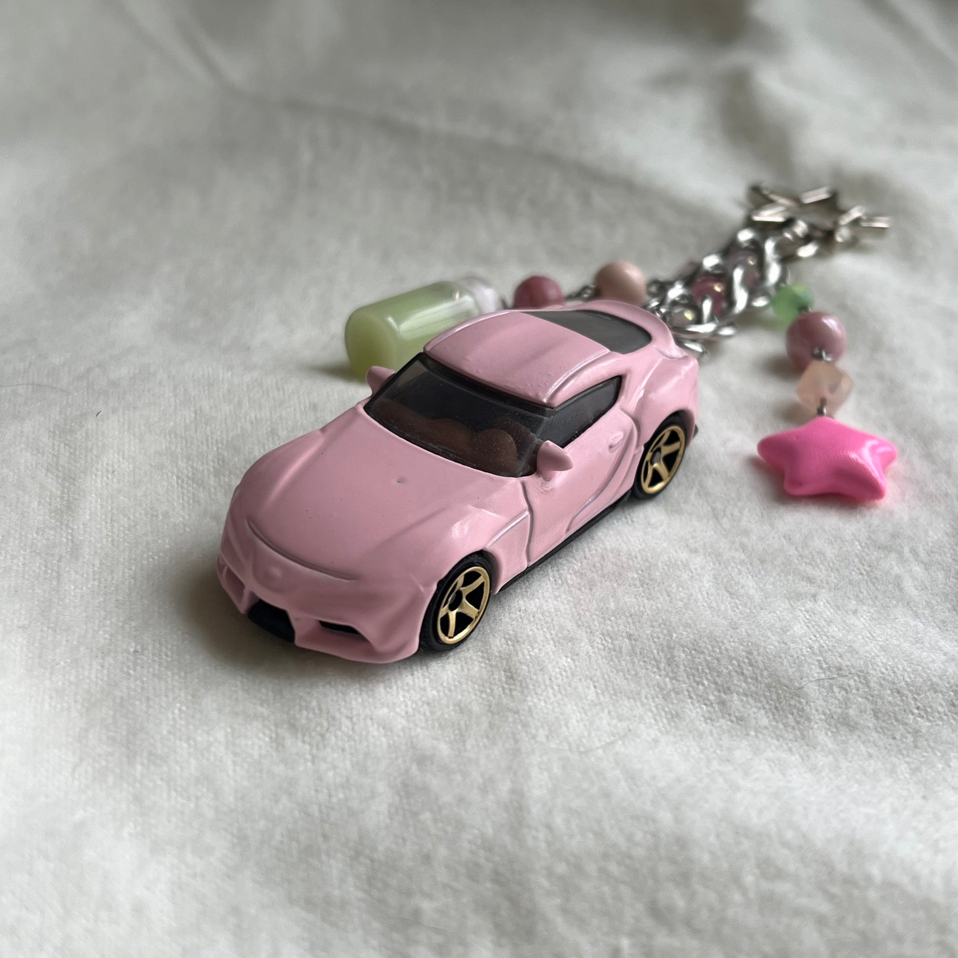 The keychains are made from 3D printed cars, resin cars, diecast cars, beads, stainless steel wire, charms, and clay. Please note that these keychains are made by hand. Because these are made by a human, and not a machine, there may be some small imperfections in the charms, beads, or any other part of the keychain.