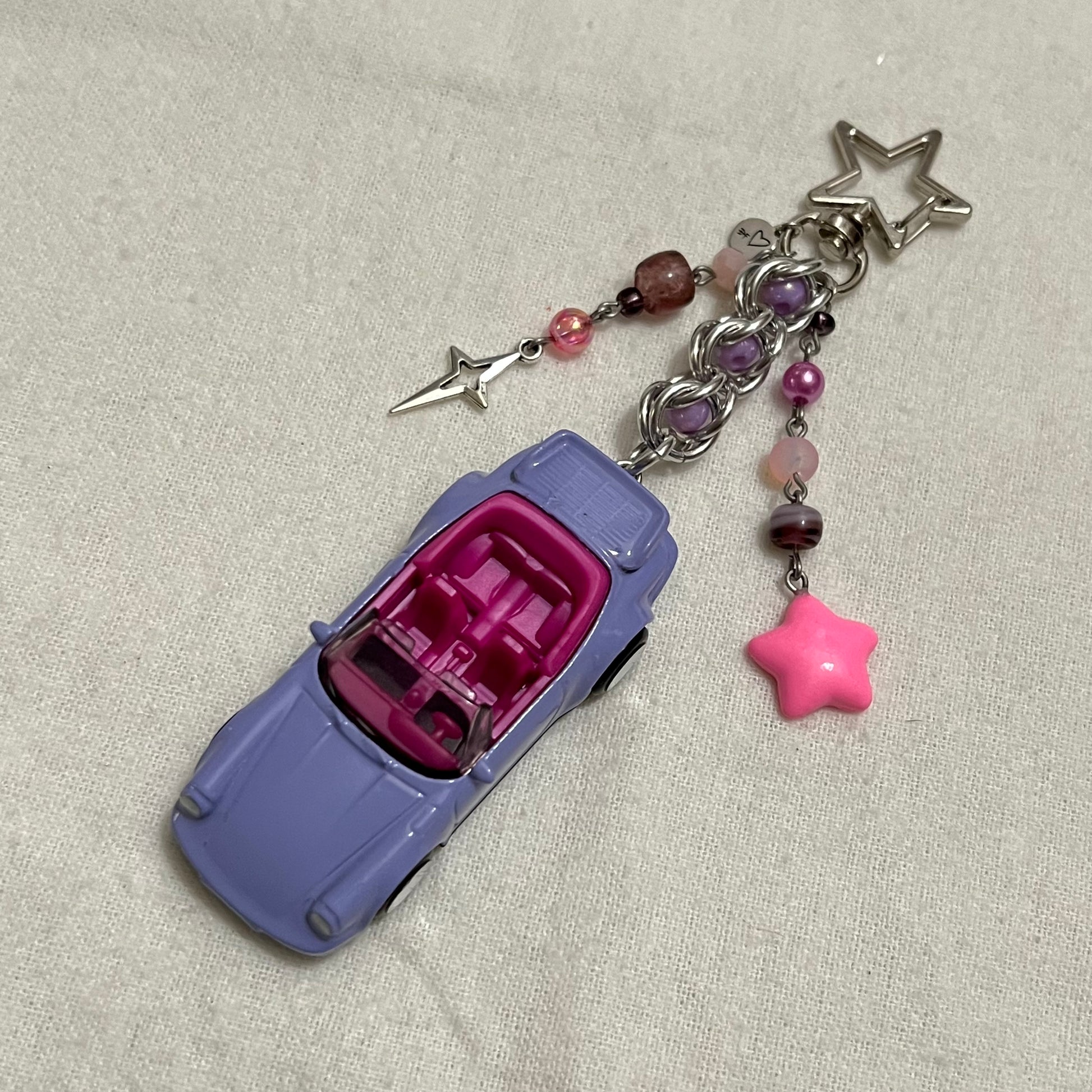 The keychains are made from 3D printed cars, resin cars, diecast cars, beads, stainless steel wire, charms, and clay. Please note that these keychains are made by hand. Because these are made by a human, and not a machine, there may be some small imperfections in the charms, beads, or any other part of the keychain.