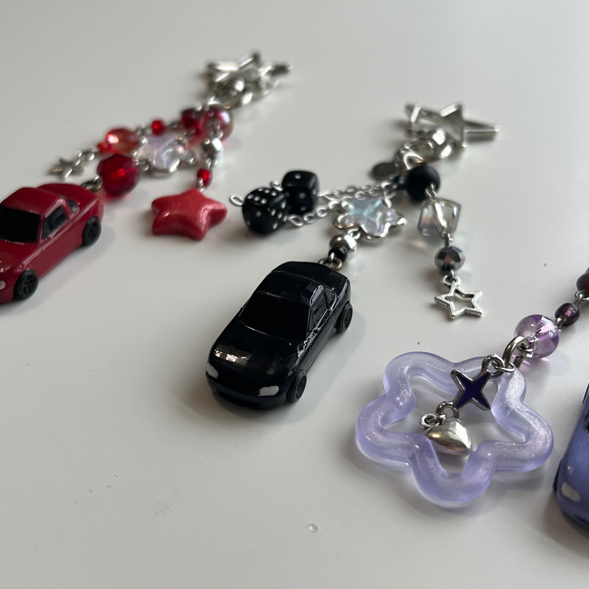 The keychains are made from 3D printed cars, resin cars, beads, stainless steel wire, charms, and clay. Please note that these keychains are made by hand. Because these are made by a human, and not a machine, there may be some small imperfections in the charms, beads, or any other part of the keychain.
