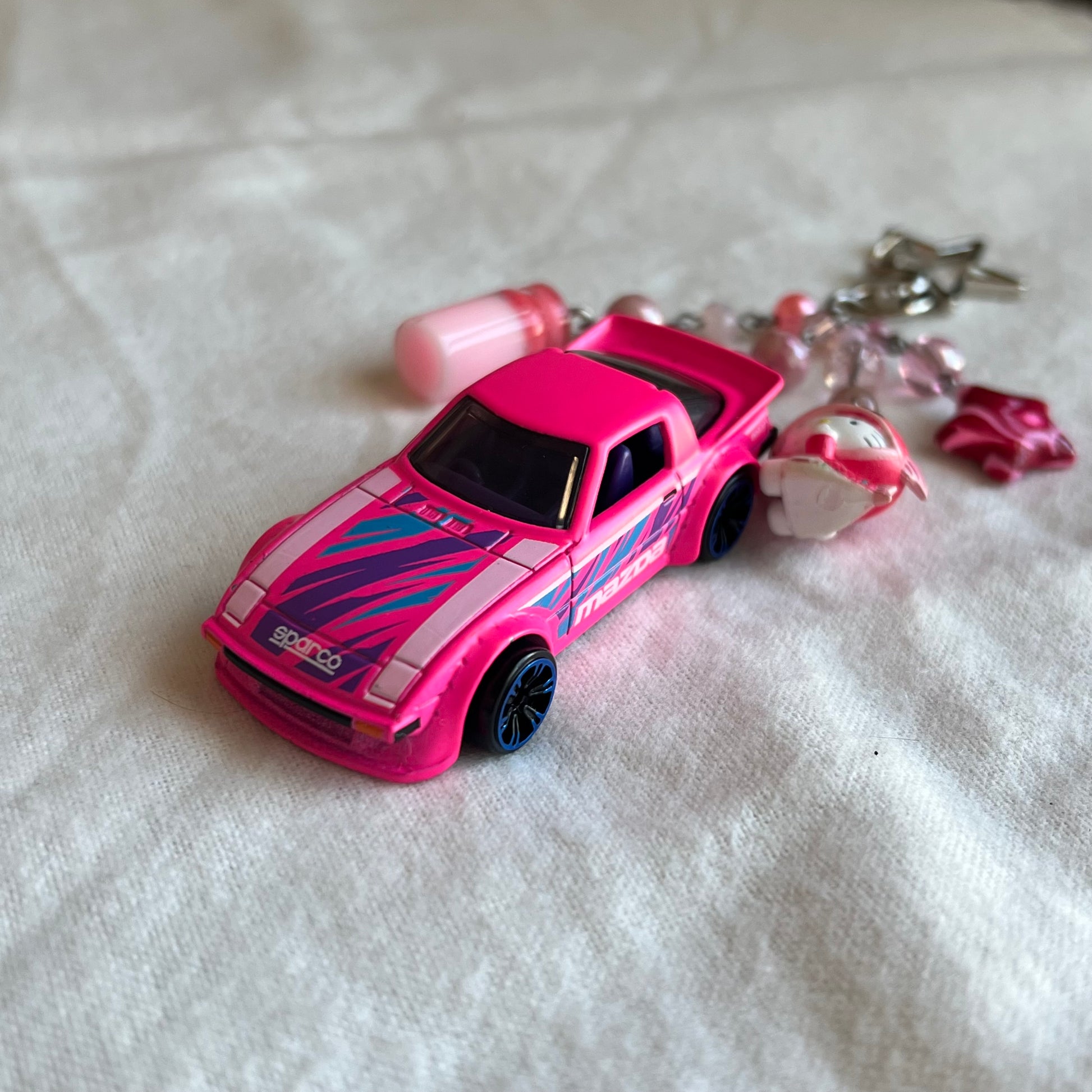 The keychains are made from 3D printed cars, resin cars, diecast cars, beads, stainless steel wire, charms, and clay. Please note that these keychains are made by hand. Because these are made by a human, and not a machine, there may be some small imperfections in the charms, beads, or any other part of the keychain.