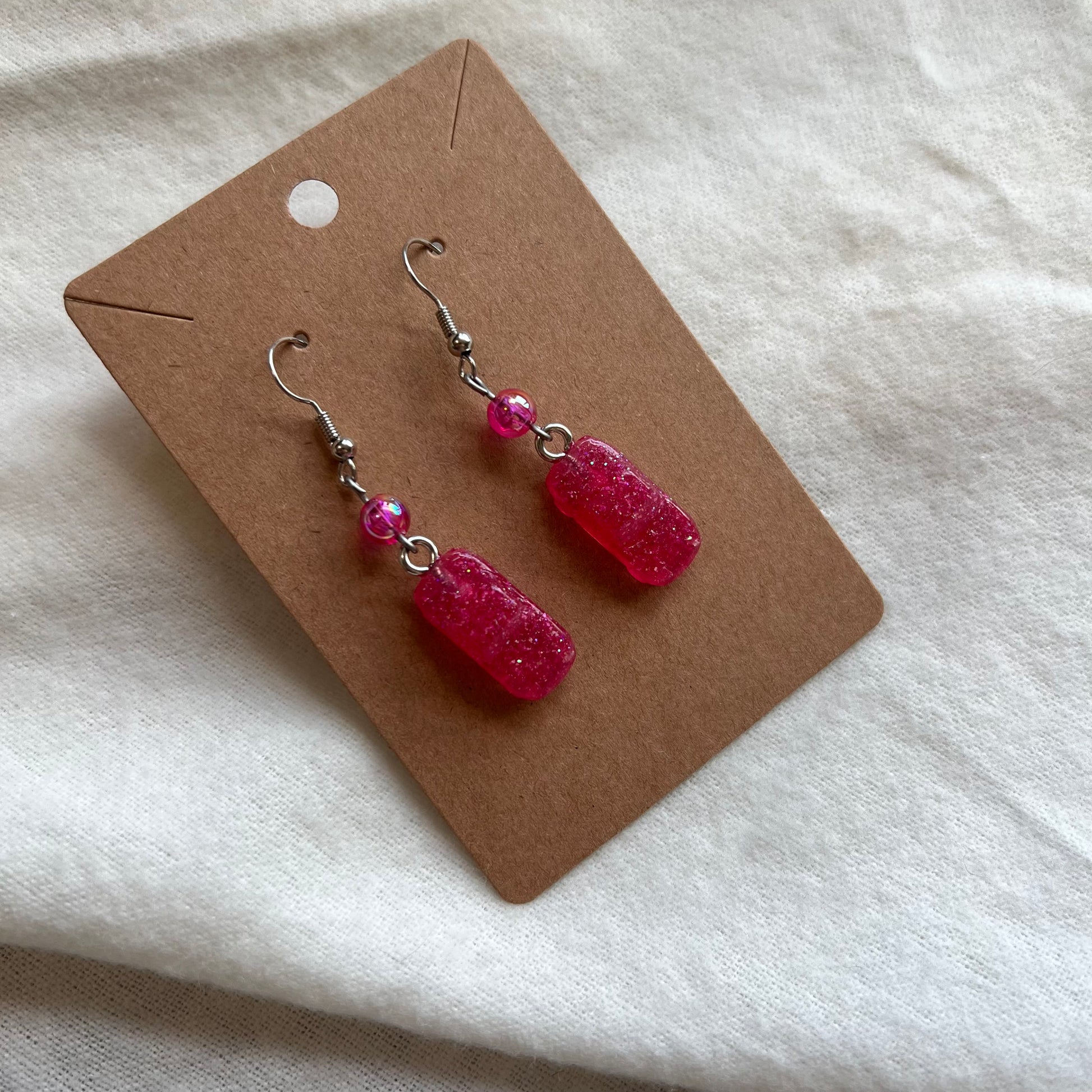 The earrings are made from 3D printed cars and resin cars, beads, stainless steel wire, charms, and clay. Please note that these earrings are made by hand. Because these are made by a human, and not a machine, there may be some small imperfections in the charms, beads, or any other part of the earrings.